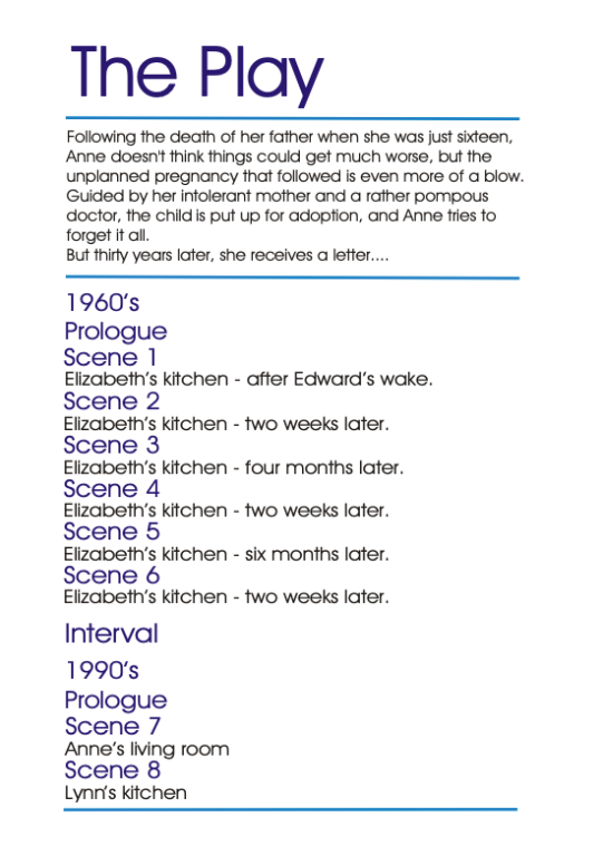 Act Two jumps forward, introducing us to an adult Tracy – now Lynn (Caroline Waterer) – as she begins the process of finding her birth parents. Anne, now a married woman with three children who know nothing of her early past, receives a letter from a social worker about the possible reunion. Discussing it with Barbara, Anne somewhat coolly claims that she doesn’t need the guilt trip. But beneath that armour lies the damage inflicted by a lifetime of silence and stigma.