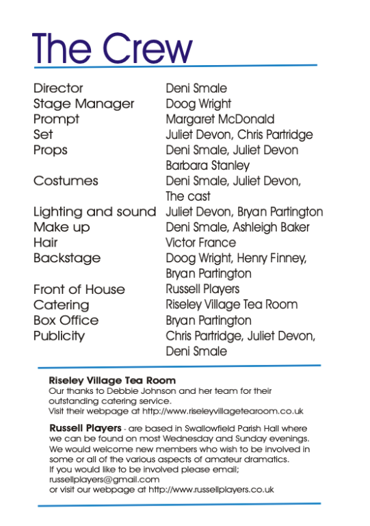 Under the direction of Deni Smale, the skilled writing of Juliet Devon, and the stage manager, Doog Wright, the Russell Players delivered another production displaying their acting versatility in a play that dared to tell us an honest and different truth. It balanced the emotional weight with empathy and quiet humour. It provided its audience with thought provoking entertainment and is another success for the Russell Players.”